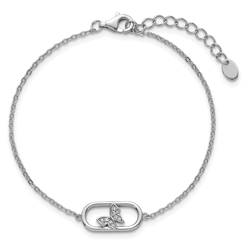 Sterling Silver Rhodium-plated CZ Oval with Butterfly with Extension Bracelet