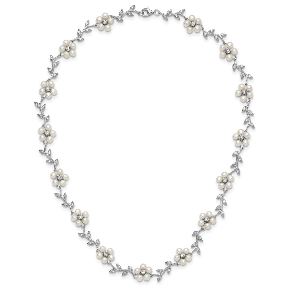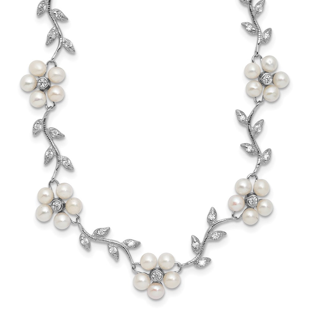 Sterling Silver Rhodium-plated CZ Vine Pattern and Fresheater Cultured Pearl Floral Necklace