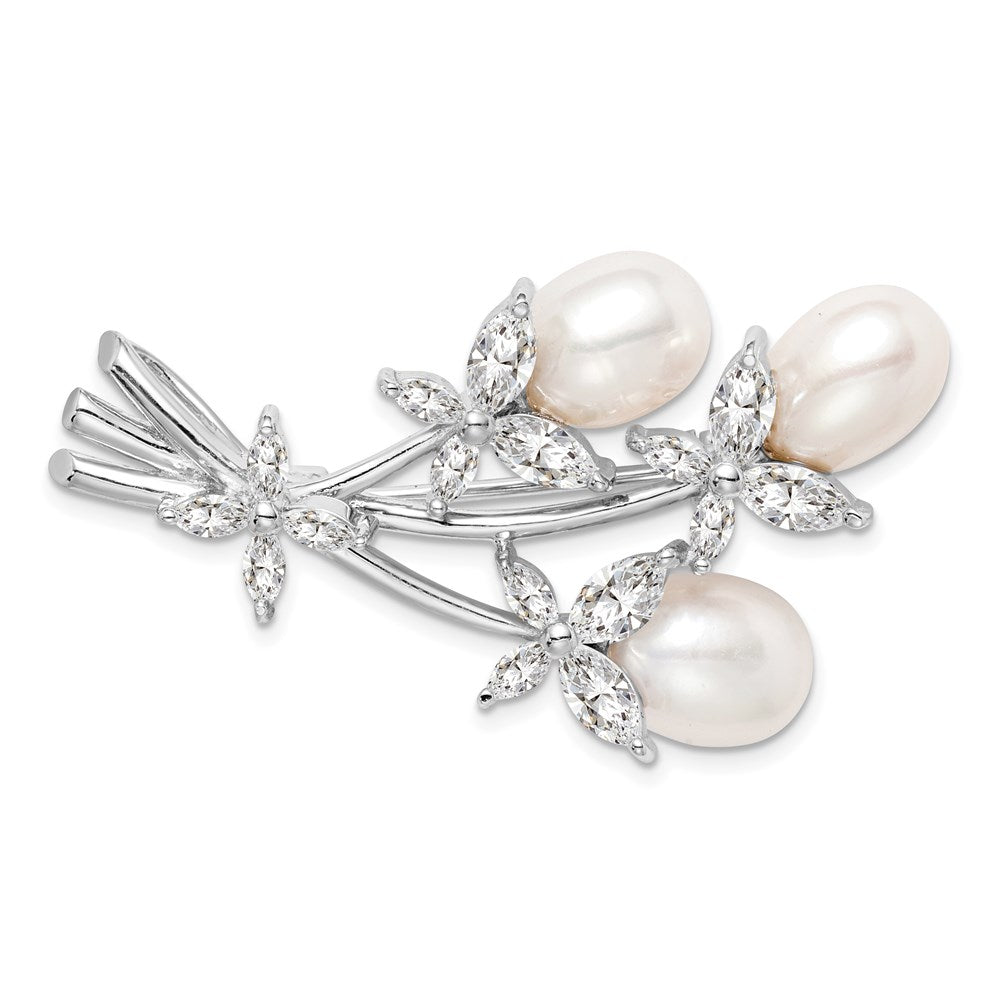 Sterling Silver Rhodium-plated Freshwater Cultured Pearl and CZ Floral Pin Brooch