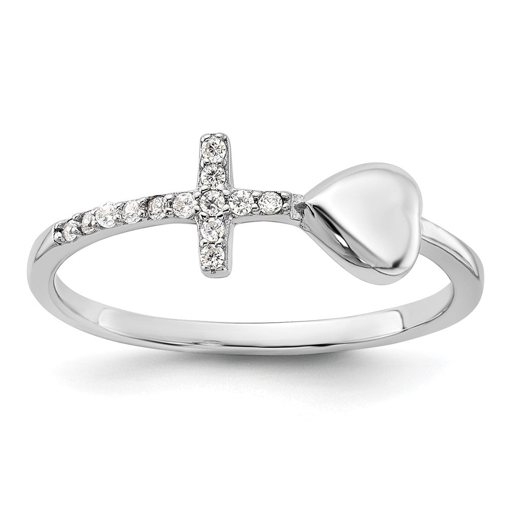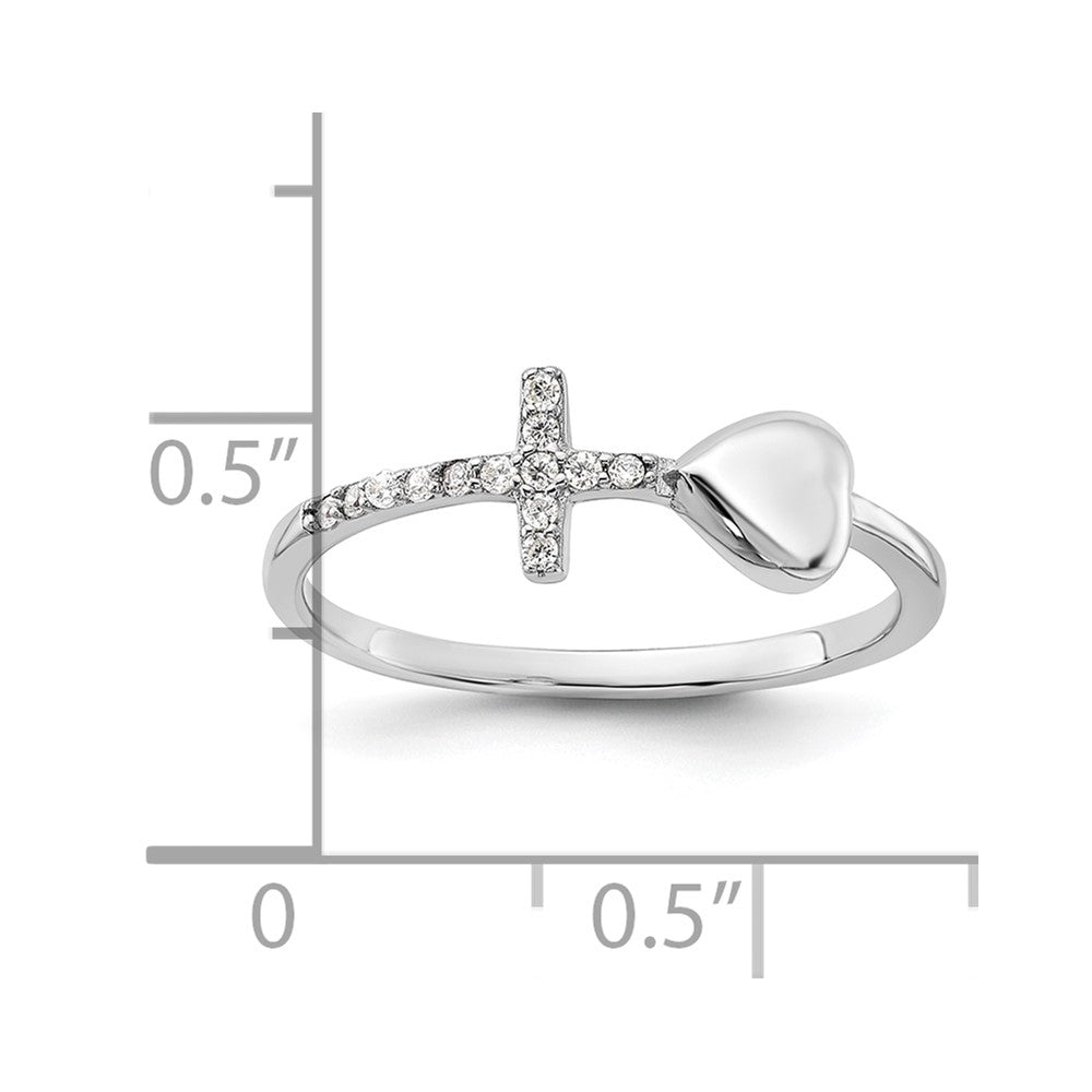 Sterling Silver Rhodium-plated Heart and CZ Cross Ring
