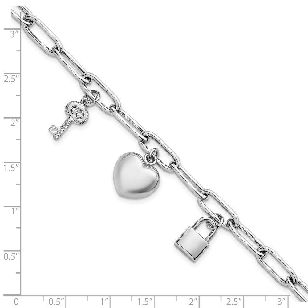 Sterling Silver Rhodium-plated Heart Lock and Key with CZ 7. Paperclip Chain Toggle Bracelet