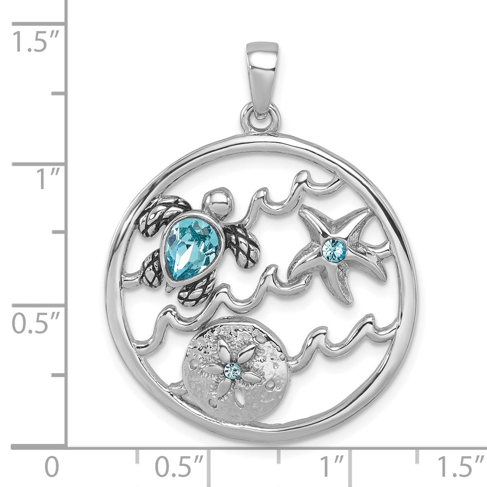 Sterling Silver Rhodium-plated Polished and Antiqued Round Crystal Sealife Pendant