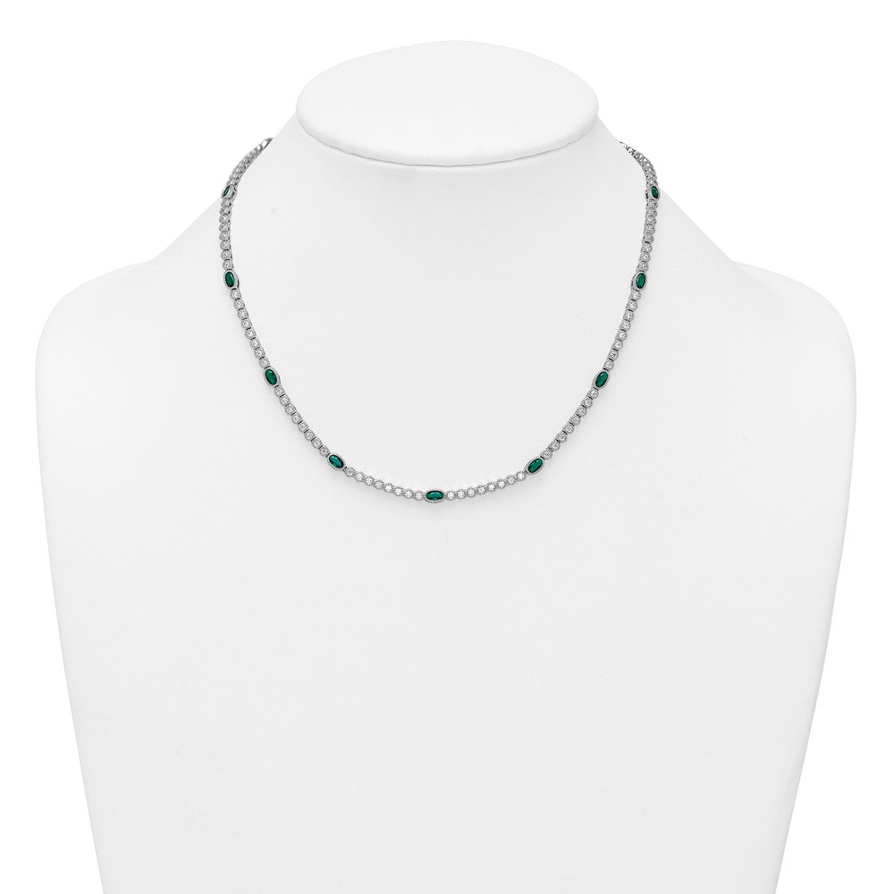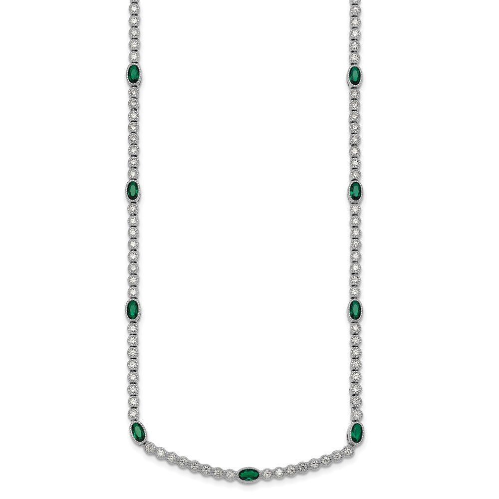 Sterling Silver Rhodium-plated Polished and Beaded Fancy Oval Green and Round White CZ Necklace