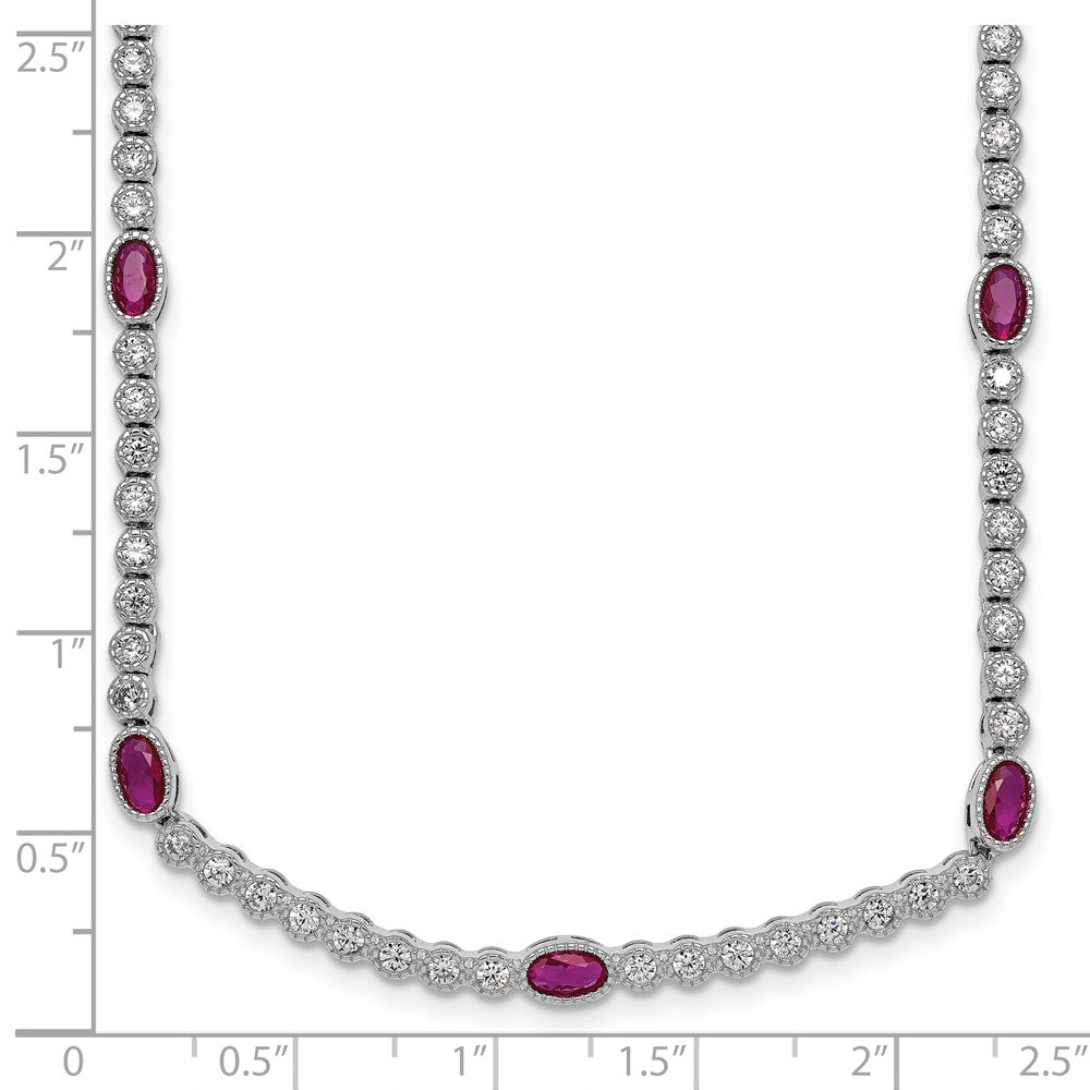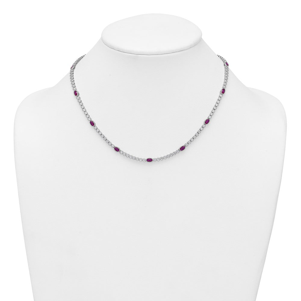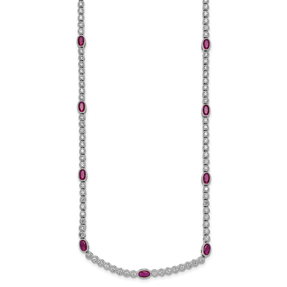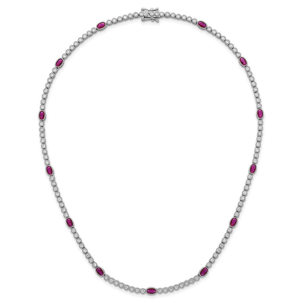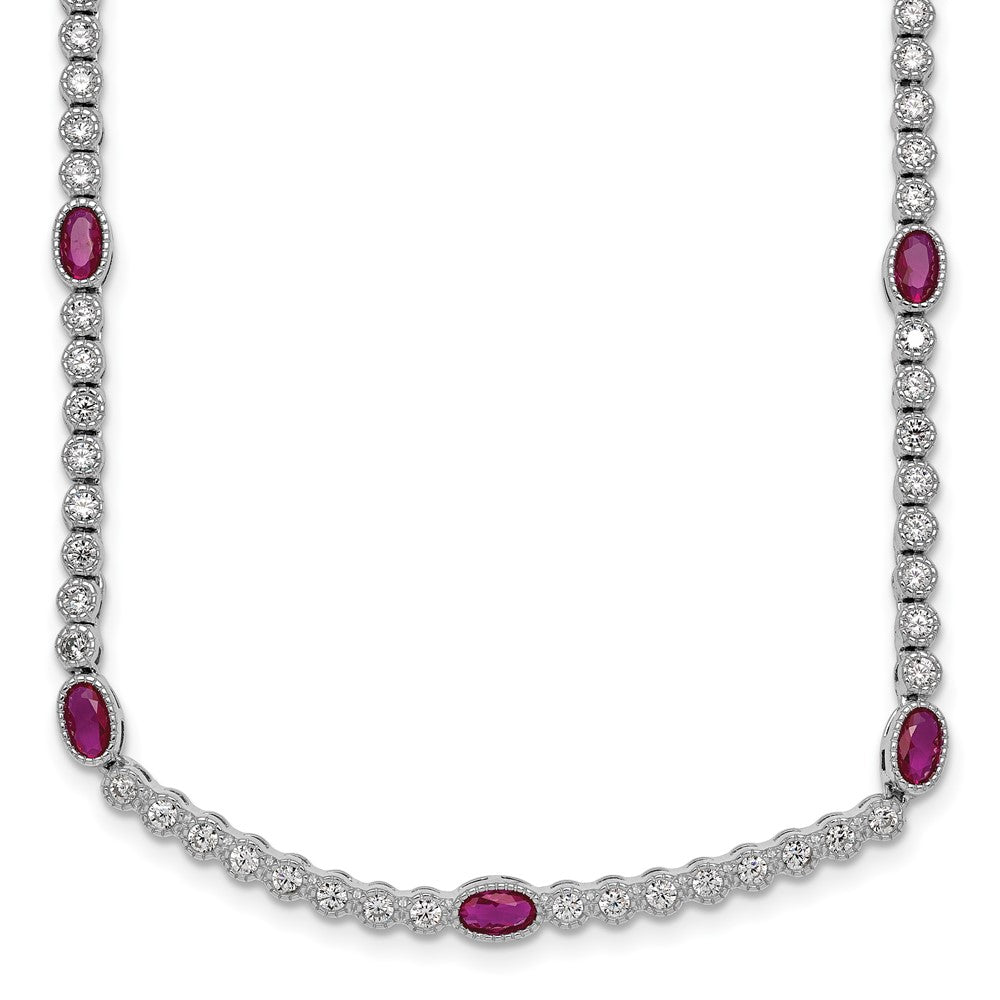 Sterling Silver Rhodium-plated Polished and Beaded Fancy Oval Red and Round White CZ Necklace