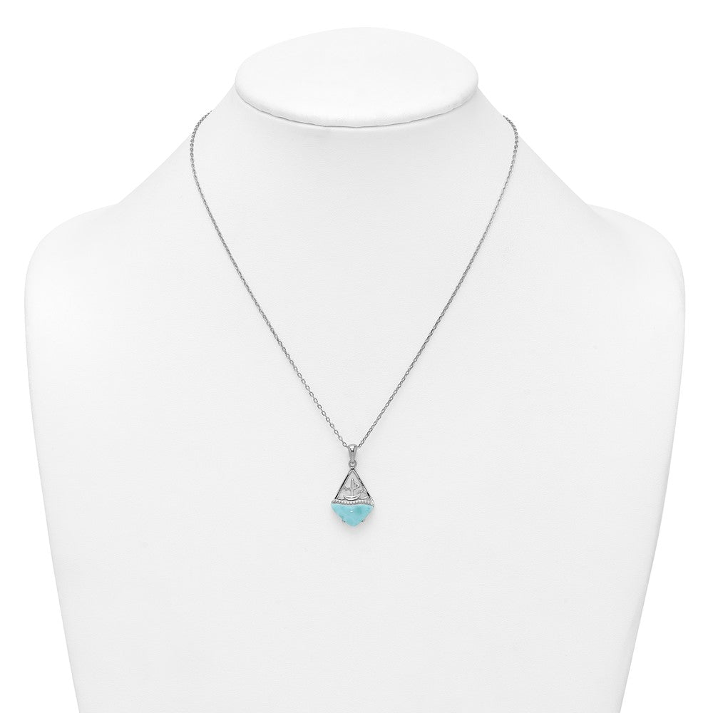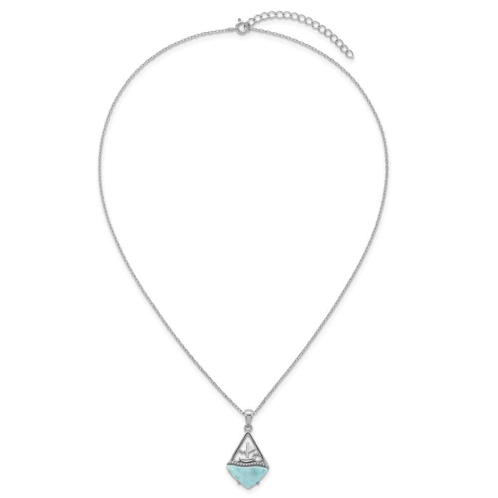 Sterling Silver Rhodium-plated Polished and Beaded Larimar Sailboat with Extension Necklace