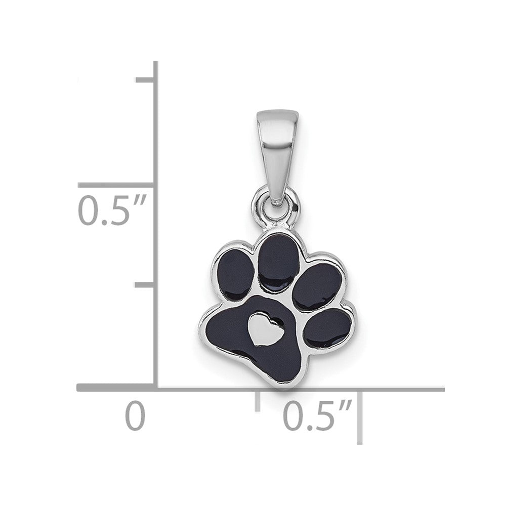 Sterling Silver Rhodium-plated Polished Black Enamel Paw Print with Heart Pendant