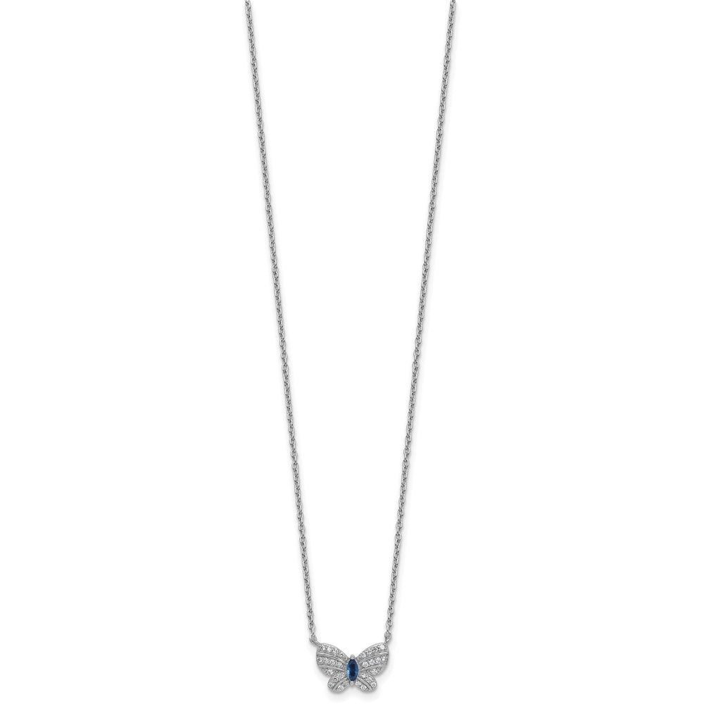Sterling Silver Rhodium-plated Polished Blue Glass and White CZ Butterfly with Extension Necklace