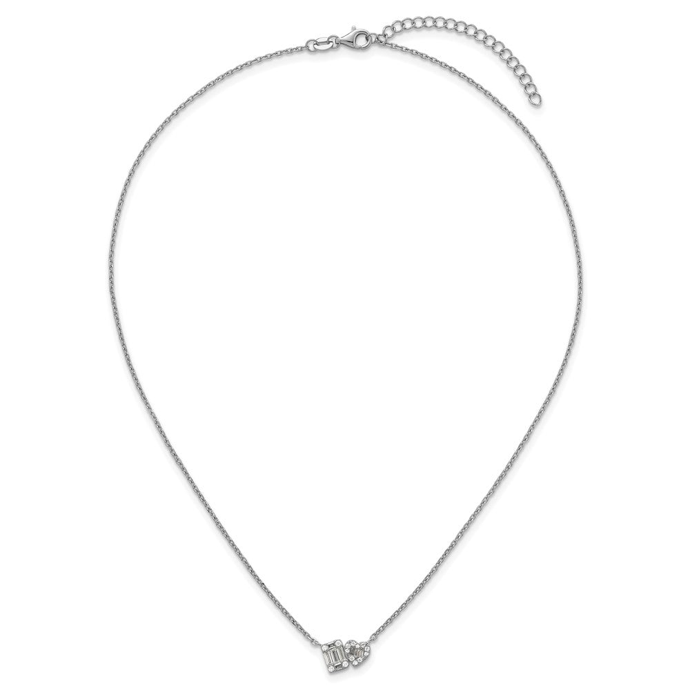 Sterling Silver Rhodium-plated Polished Heart and Rectangle with Round and Baguette CZ with Extension Necklace