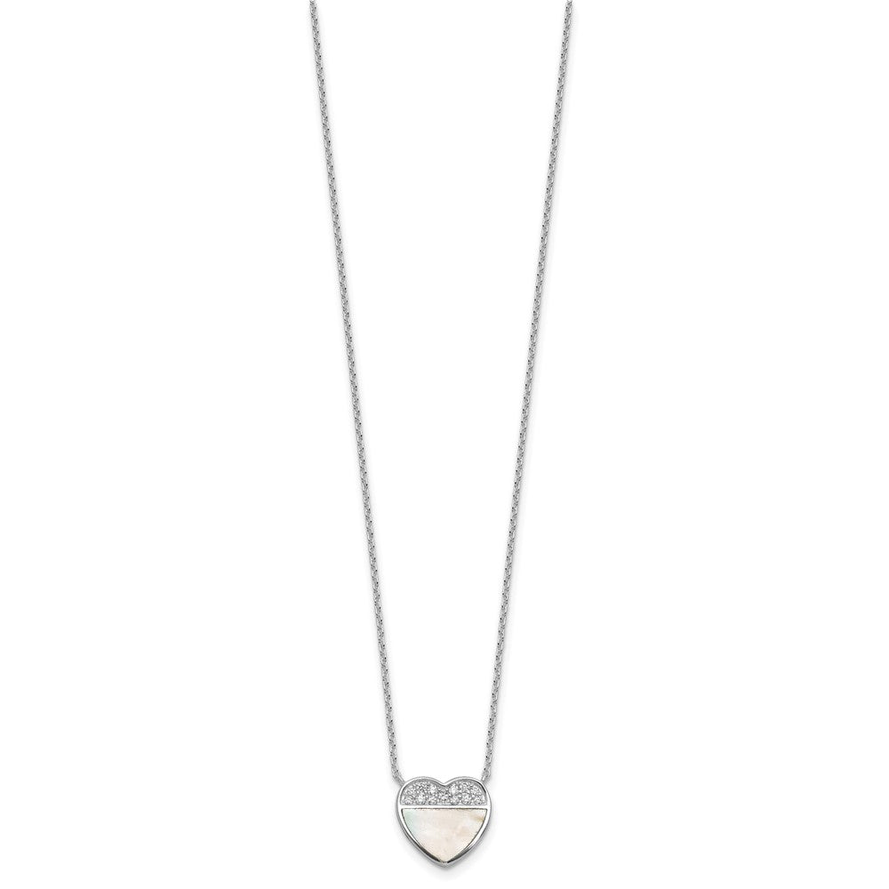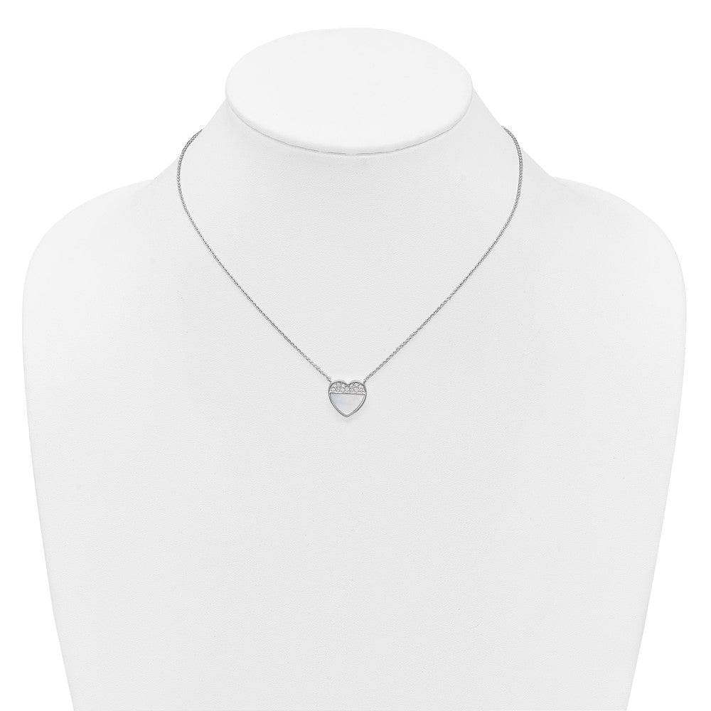 Sterling Silver Rhodium-plated Polished Mother of Pearl and CZ Heart with Extender Necklace