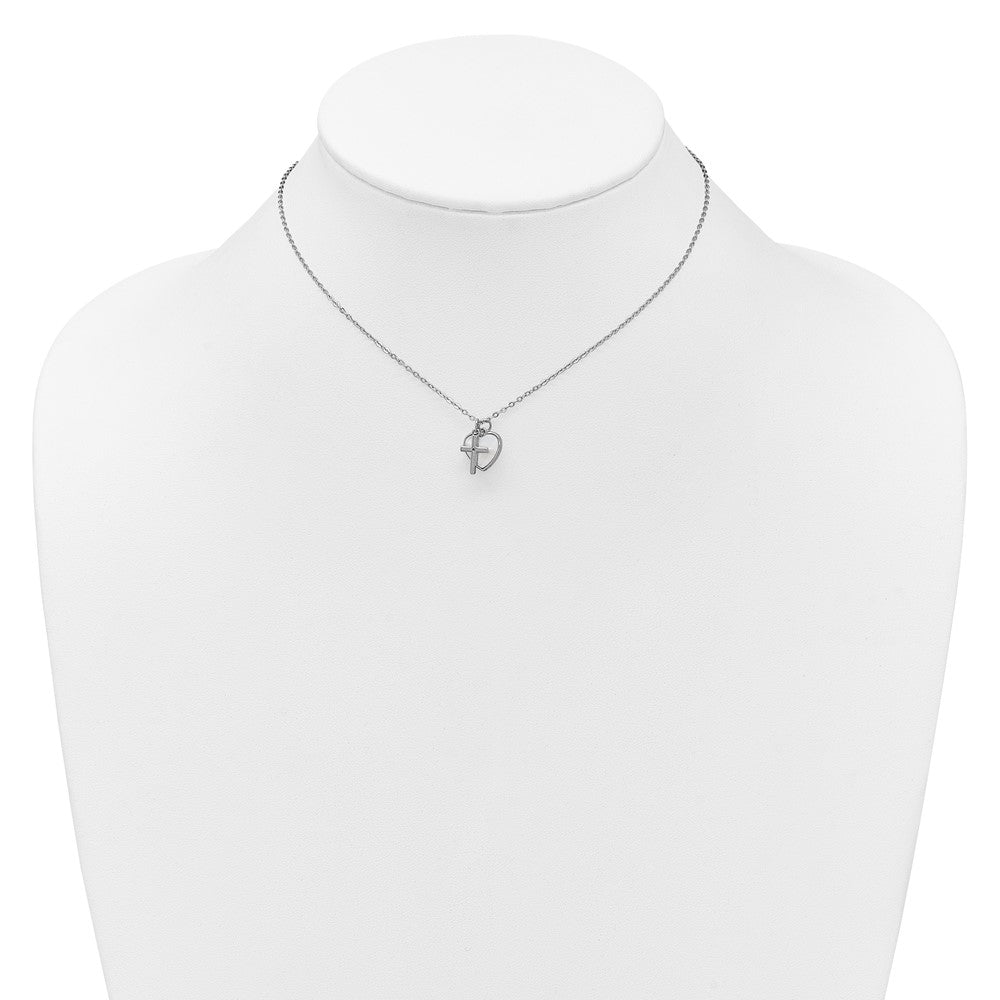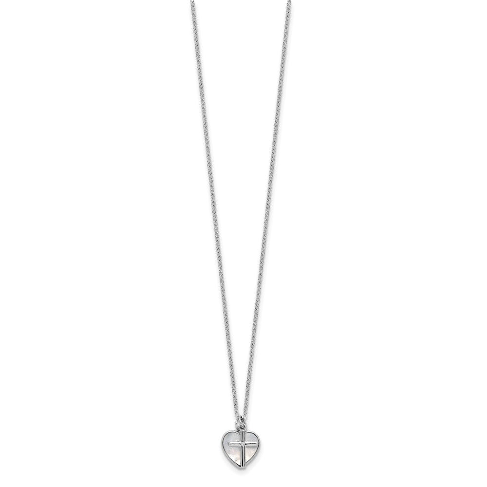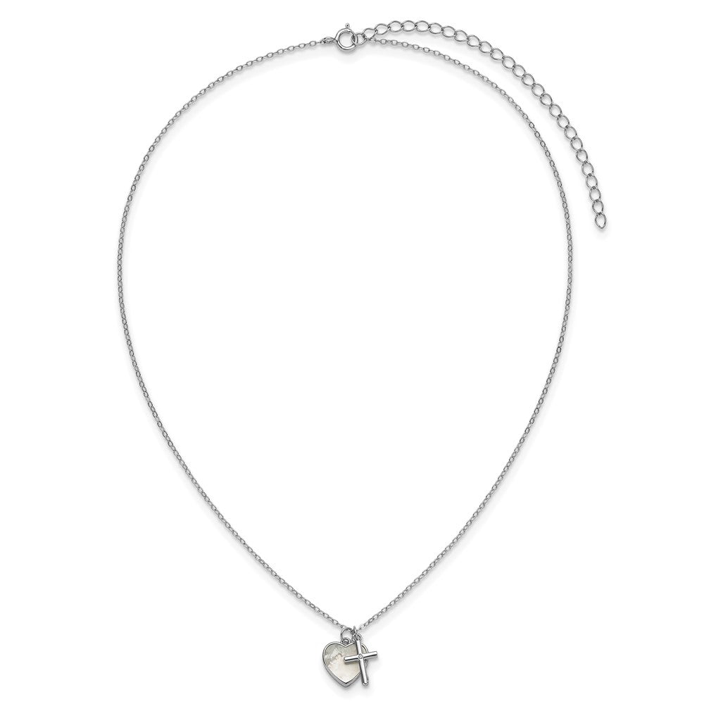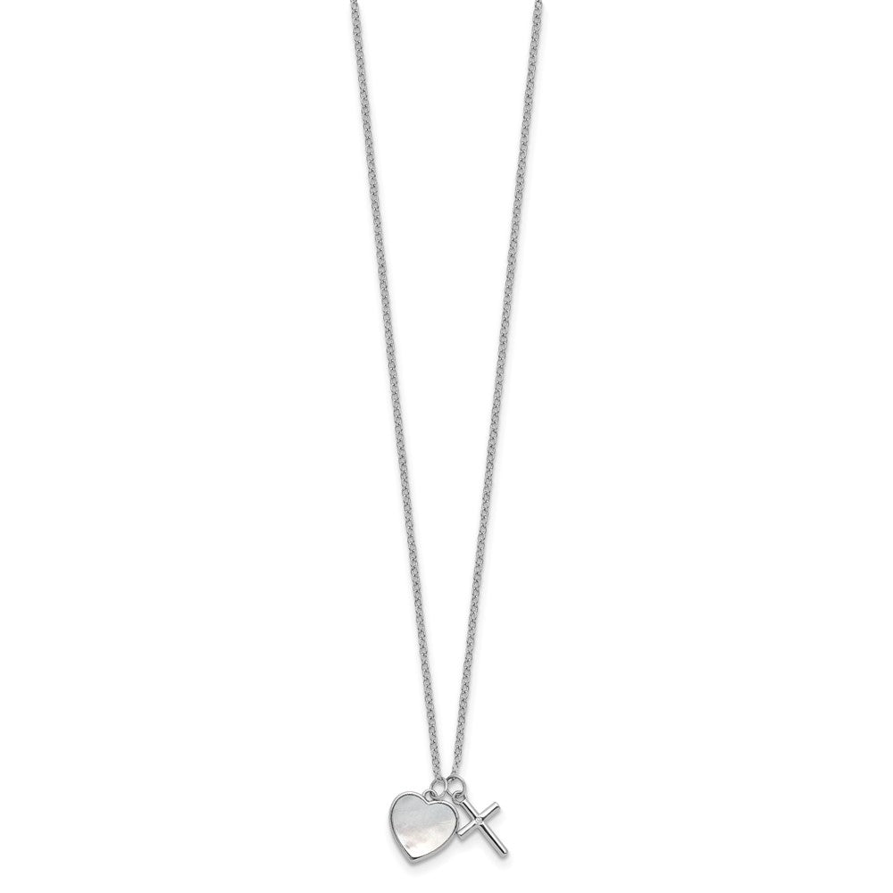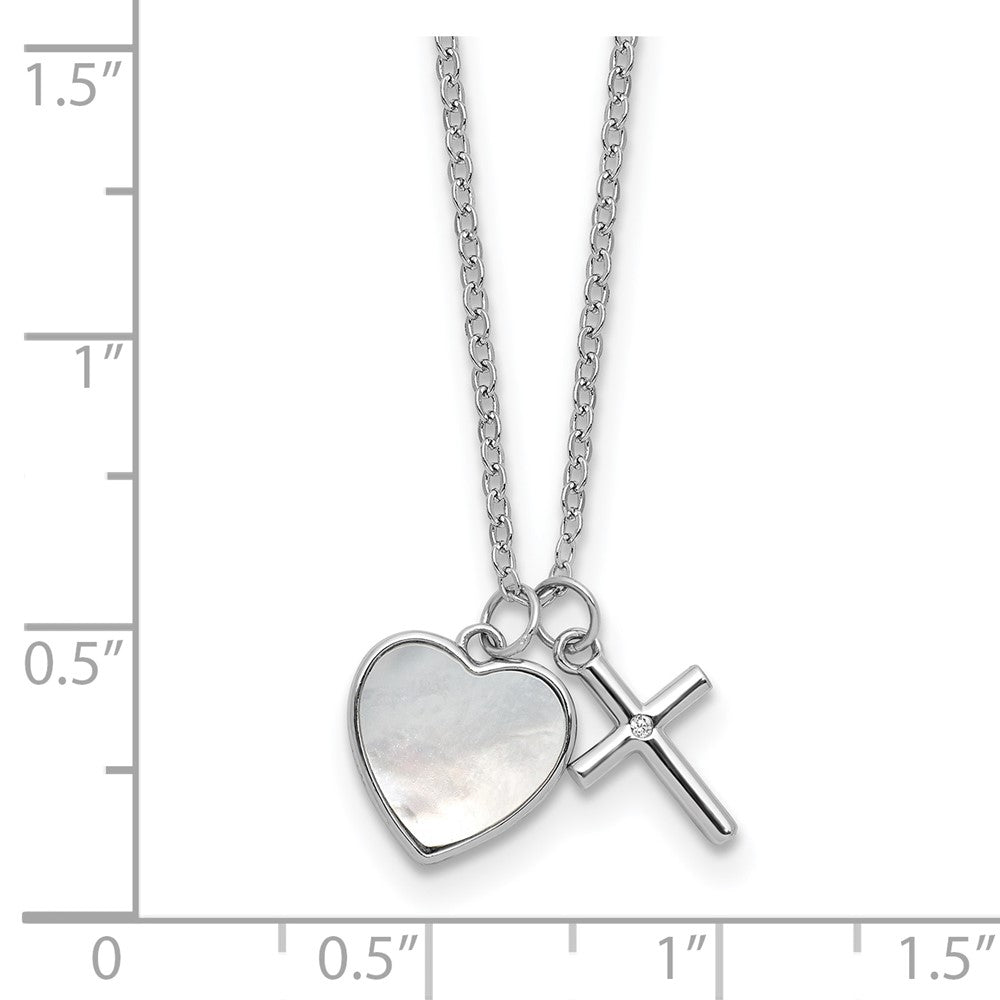 Sterling Silver Rhodium-plated Polished Mother of Pearl Heart and CZ Cross with Extension Children's Necklace