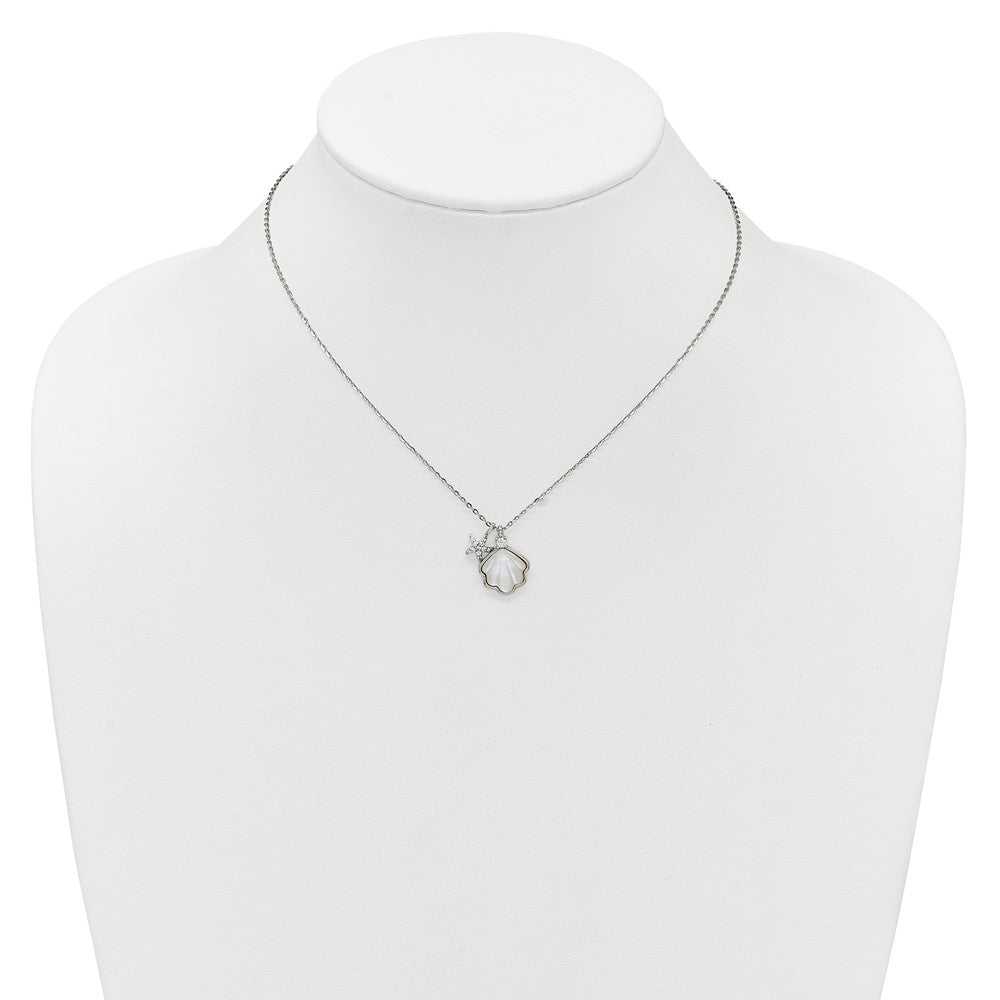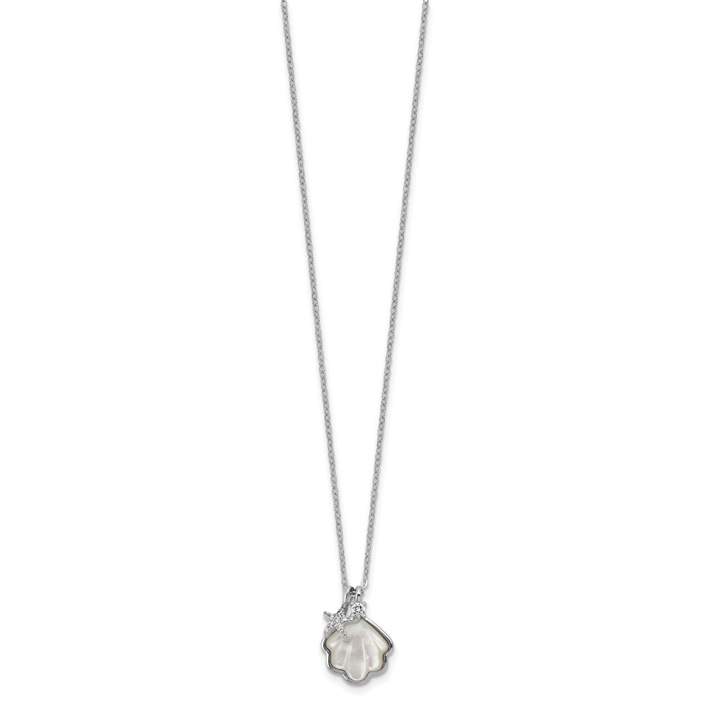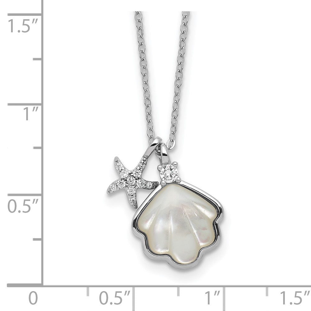 Sterling Silver Rhodium-plated Polished Mother of Pearl Shell and CZ Starfish with Extension Necklace