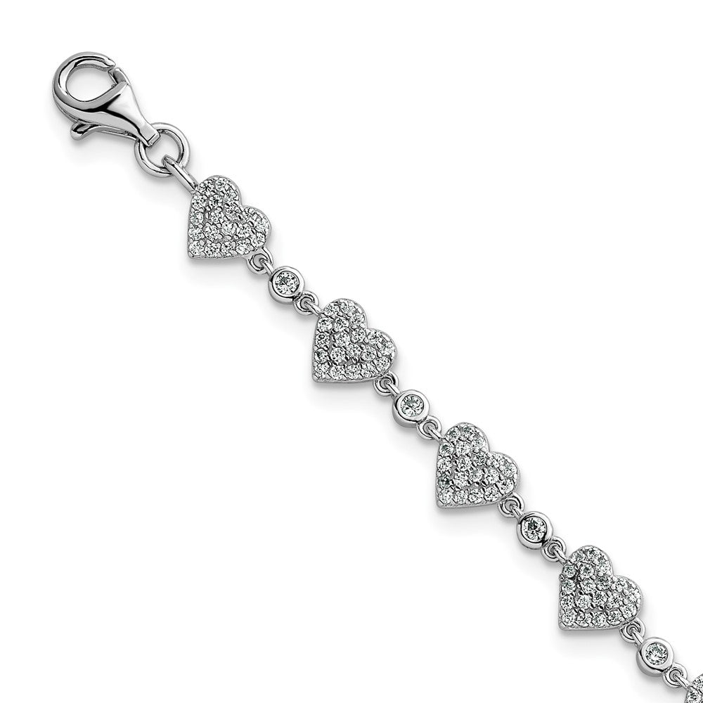 Sterling Silver Rhodium-plated Polished Pave CZ Hearts with Extension Bracelet