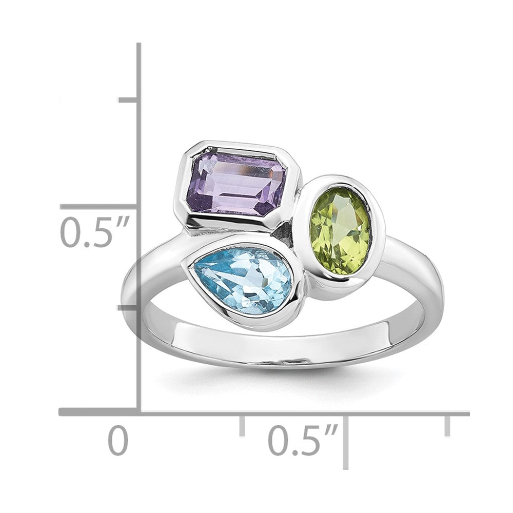 Sterling Silver Rhodium-plated Polished Pear Blue Topaz, Oval Peridot and Emerald-cut Amethyst Size 8 Ring
