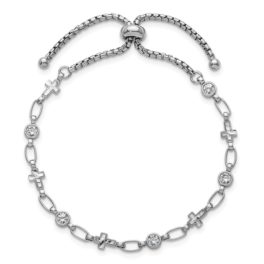 Sterling Silver Rhodium-plated Polished Round CZ and Cross Adjustable Bolo Bracelet