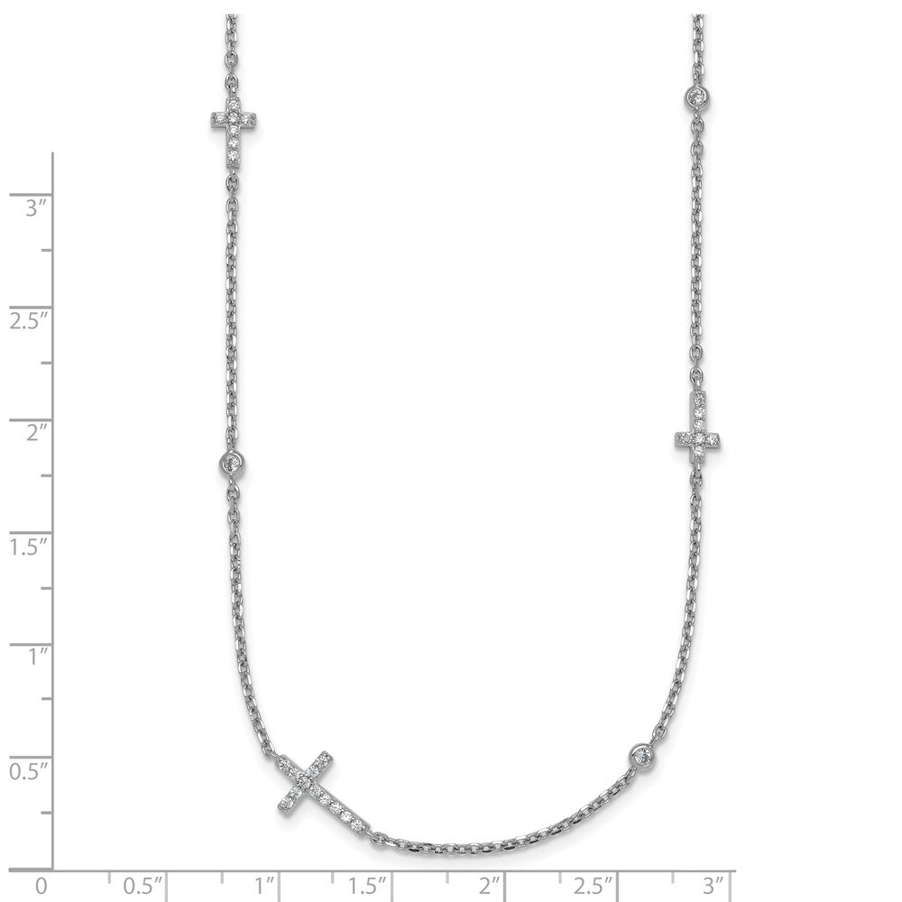 Sterling Silver Rhodium-plated Polished Three CZ Crosses and 3 Round CZ Stations with 1. Extender Necklace