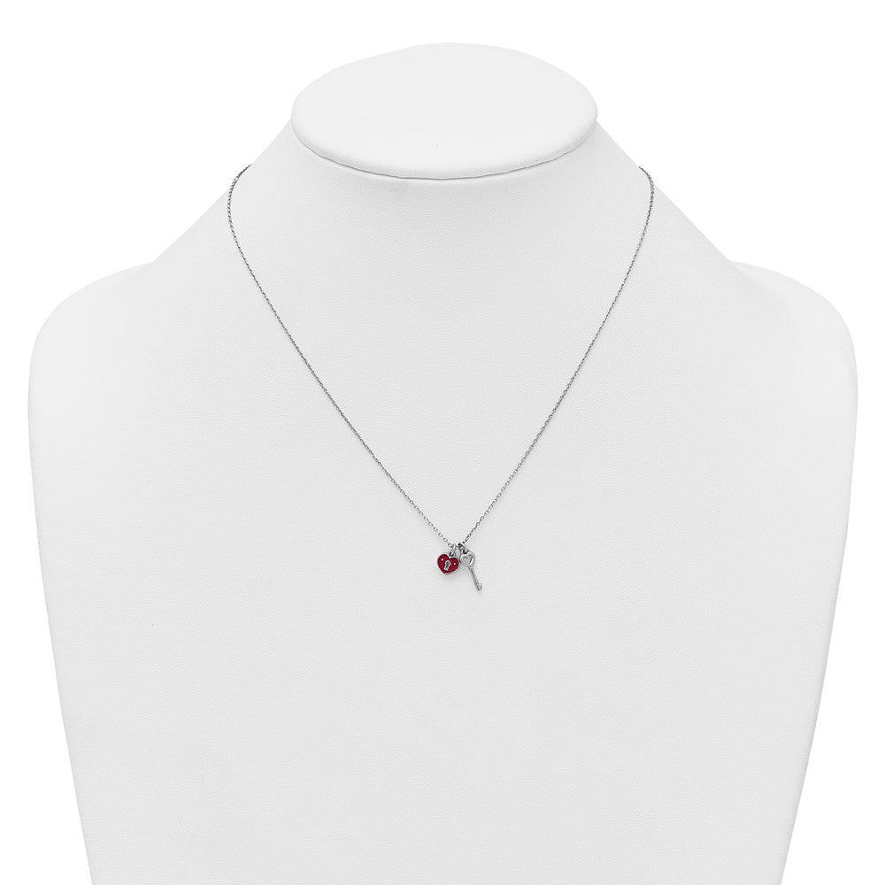 Sterling Silver Rhodium-plated Red Enameled Heart Lock and Key with extension Necklace