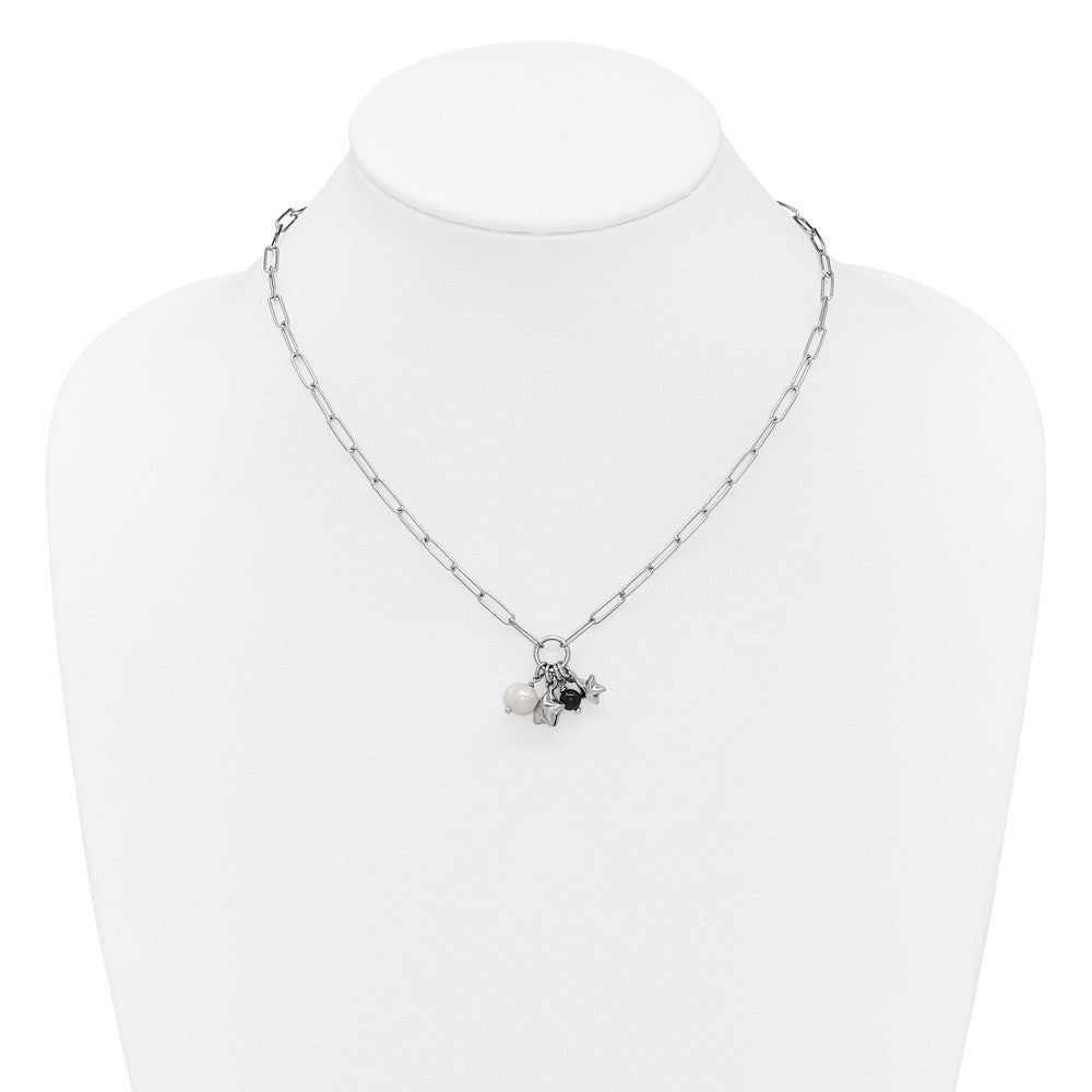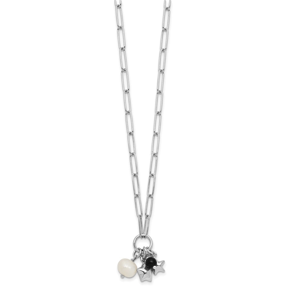 Sterling Silver Rhodium-plated Stars and White Freshwater Cultured Pearl and Black Acrylic Bead 17. with Extender Paperclip Necklace