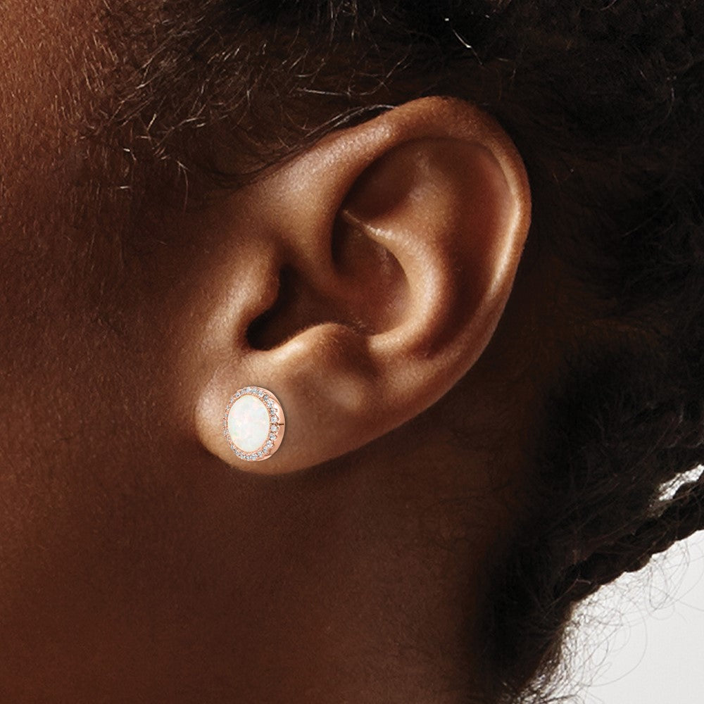 Sterling Silver Rose-Tone Created Opal & CZ Round Halo Post Earrings