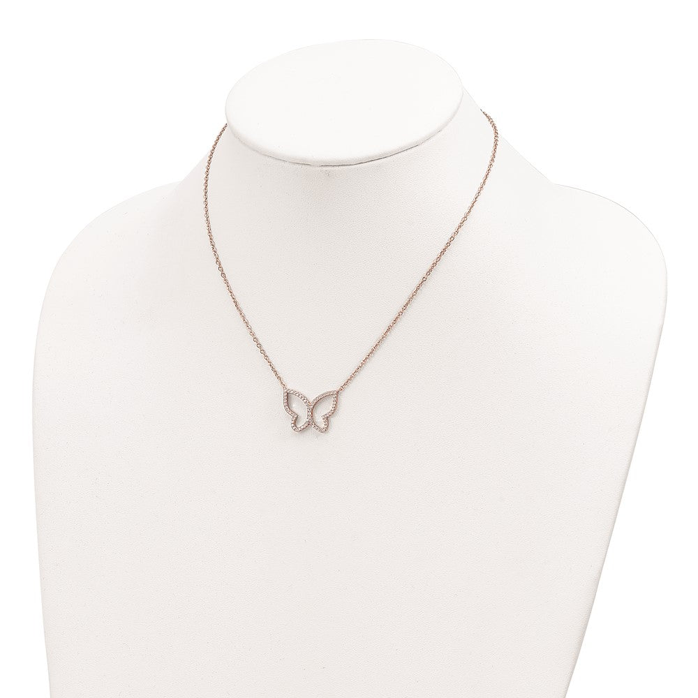 Sterling Silver Rose-tone Polished Open Butterfly CZ w/2 in ext. Necklace