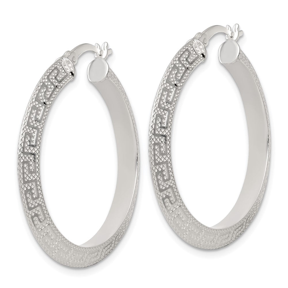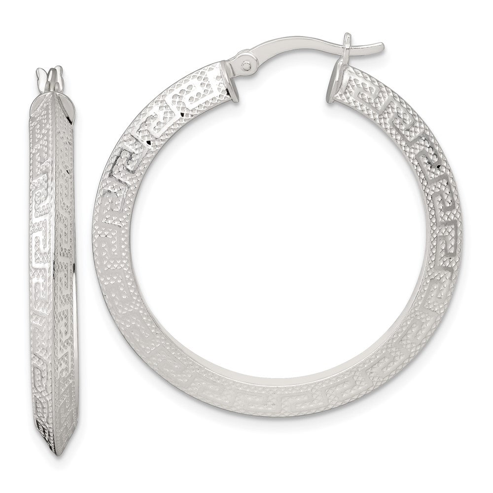 Sterling Silver Textured 35x4. Knife Edge Greek Key Round Hoop Earrings