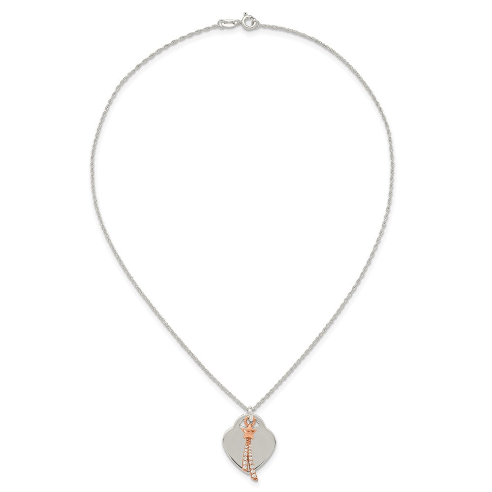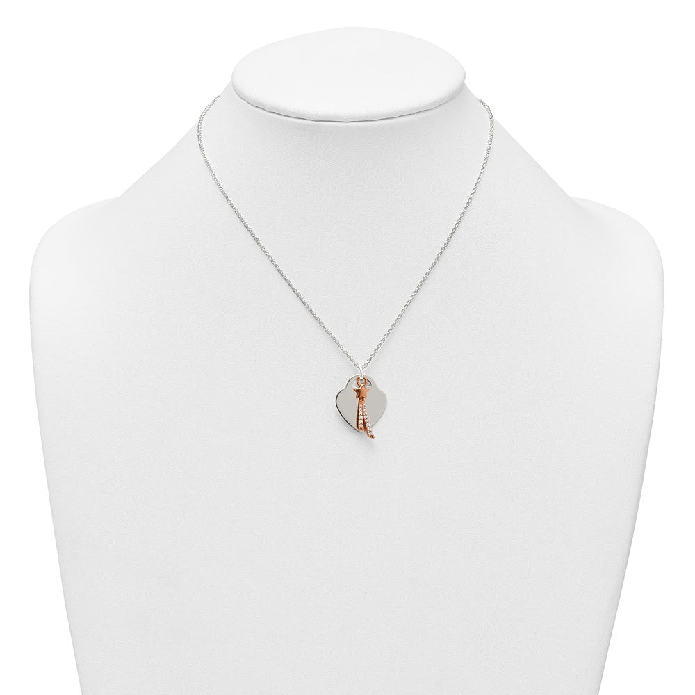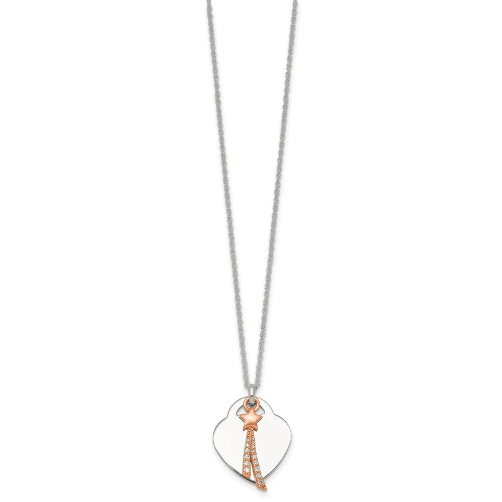 Sterling Silver with Rose-tone Polished White CZ Heart and Shooting Star Dangle Necklace